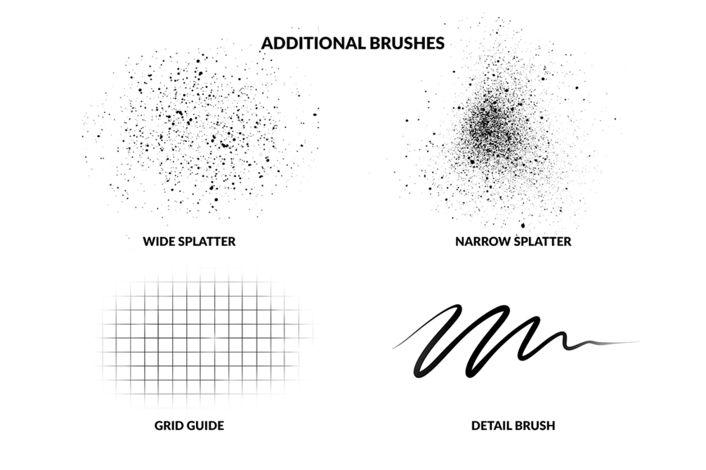 • 2 unique splatter brushes. Made from real paint splatters, these highly-flexible brushes are great for adding texture and depth to your work.
