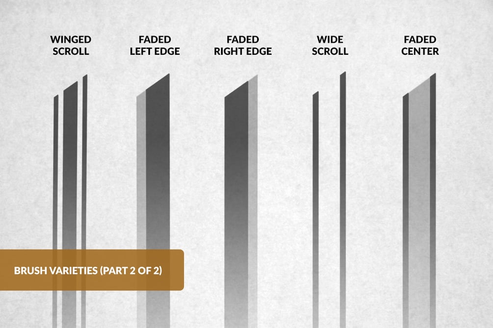 - Linear 5-Line Scroll Blackletter Brush: A flat pen comprised of 5 striped lines in 3 angles (35º, 40º, and 45º).
