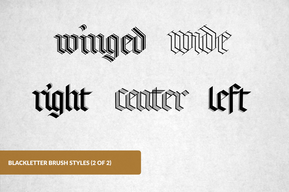 - Faded Left-Side Blackletter Brush: A flat pen with a left-hand “faded” shadow in 3 angles (35º, 40º, and 45º).