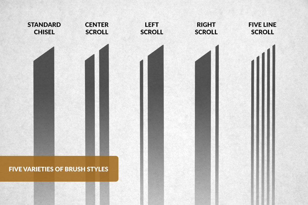 • Linear Scroll Blackletter Brush: A flat pen comprised of 5 striped lines in 3 angles (35º, 40º, and 45º).