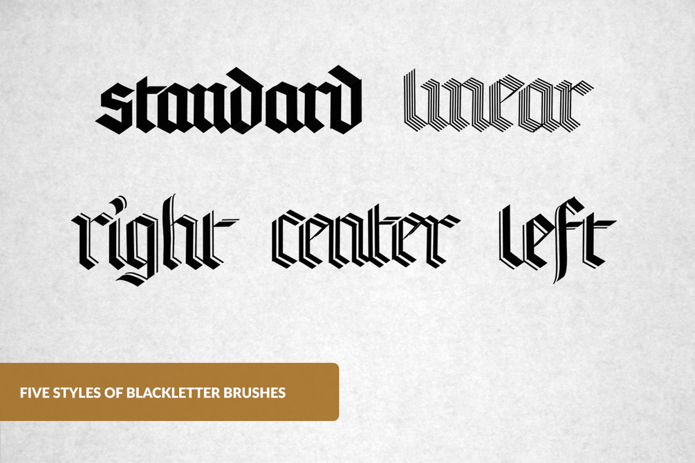 This set includes a variety of 5 blackletter brushes (each in 3 angles — 35º, 40º, and 45º) as well as guide brush to help you create templates — a total of 16 brushes!